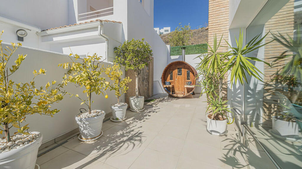LARGE, WONDERFUL VIEW VILLA – TORREBLANCA DEL SOL – FUENGIROLA – MÁLAGA – SPAIN Bright and spacious, south-facing villa of 379 m2, with i.a. 2 living rooms, 6 bedrooms, 4 full bathrooms, glass-covered patio, large garage and double carport. Located at the top of quiet Torreblanca del Sol with corresponding 360 degree views of the Mediterranean, Fuengirola, Mijas, and El Higuerón. The villa is spread over three floors, which are externally fitted with white PVC security windows and security doors throughout. A / C, door phones with screens, internal telephone system, fiber connection to Movistar with router and 2 access points that cover WiFi throughout the property. The upper floor of 90.20 m2, consists of 1 large master bedroom with security door, fitted wardrobes and with 1 full bath en suite, 2 spacious bedrooms with fitted wardrobes and 1 full bathroom on the distribution corridor where there are additional wardrobes. There is access to a magnificent, south-facing and secluded sun terrace of 22 m2, with a fantastic view of the Mediterranean. The middle floor of 143.60 m2, consists of a covered main entrance, hall, a stately living room, 1 bedroom with full bath en suite and wardrobe corridor, a large and delicious, fully equipped kitchen with everything in Siemens equipment. There is access from the living room as well as from the kitchen to terraces that are covered with projecting awnings. The terraces and a lawn surround the villa’s magnificent swimming pool, which measures 9.30 x 4.40 meters and is 2 m at its deepest. A wide carport provides shade for two cars. The lower floor of 84.60 m2, contains a separate apartment with its own entrance and terrace. Living room with open kitchen, security door to 2 bedrooms, glass-covered patio and a luxurious bathroom with jacuzzi spa. There is access to the rest of the villa via a fire door. In addition, there is a spacious garage with access to the rest of the villa through a security door. Two modern water tanks (2,000 liters) ensure uninterrupted water supply to the property. Fuse panel with overvoltage and undervoltage relays. The villa is illuminated at night by 11 powerful LED spots, 7 of which are directed by twilight relays and 4 by motion relays. In addition, the gardens are equipped with 80 LED bulbs, which give an exclusive impression of the subtropical / tropical planting and of the various decorative garden figures. The entire property is equipped with a sophisticated alarm system connected to SECTOR ALARM and with internal cameras and a CCTV system. This means that you can also monitor your property via your own mobile phone, wherever you are in the big world. The property must be seen!